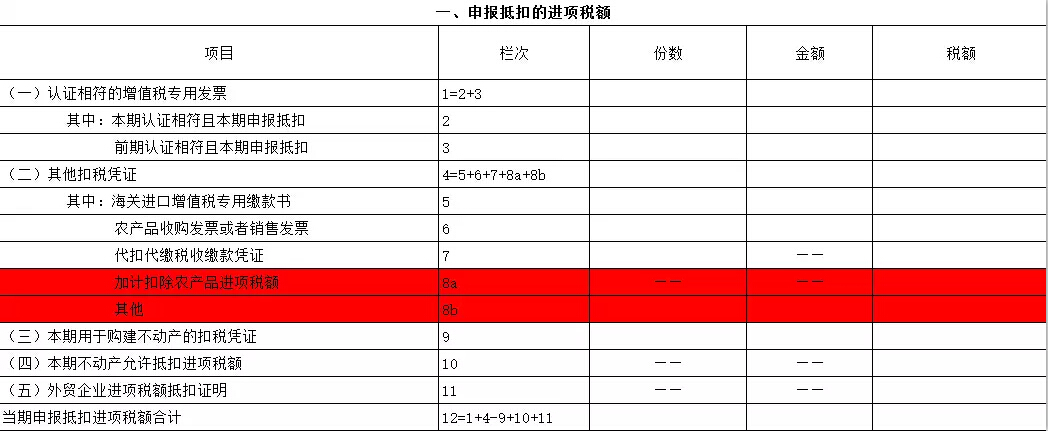 新增8a"加計(jì)扣除農(nóng)產(chǎn)品進(jìn)項(xiàng)稅額"欄,填寫納稅人將購進(jìn)的農(nóng)產(chǎn)品用于生產(chǎn)銷售或委托受托加工17%稅率時(shí),為維持原農(nóng)產(chǎn)品扣除力度不變加計(jì)扣除的農(nóng)產(chǎn)品進(jìn)項(xiàng)稅額。該欄不填寫"份數(shù)""金額",執(zhí)行農(nóng)產(chǎn)品增值稅進(jìn)項(xiàng)稅額核定扣除辦法的農(nóng)產(chǎn)品進(jìn)項(xiàng)稅額不填列在該欄。