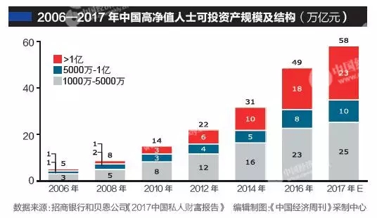 招行和貝恩的報(bào)告預(yù)計(jì),2017年高凈值人群持有財(cái)富總量將達(dá)58萬(wàn)億元,同比增長(zhǎng)19%,人均擁有3670萬(wàn)元可投資資產(chǎn)。中國(guó)私人財(cái)富市場(chǎng)總體處于快速增長(zhǎng)階段,具有巨大增長(zhǎng)潛力和空間。