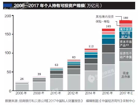 招行和貝恩的報(bào)告預(yù)計(jì),2017年高凈值人群持有財(cái)富總量將達(dá)58萬(wàn)億元,同比增長(zhǎng)19%,人均擁有3670萬(wàn)元可投資資產(chǎn)。中國(guó)私人財(cái)富市場(chǎng)總體處于快速增長(zhǎng)階段,具有巨大增長(zhǎng)潛力和空間。