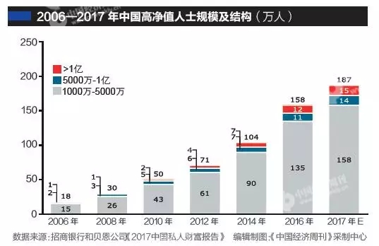 根據(jù)招行和貝恩的報(bào)告,高凈值人士的數(shù)量從2006年的18萬(wàn)人增長(zhǎng)到2016年的158萬(wàn)人,相當(dāng)于過(guò)去11年間,每天有接近400張“新面孔”躋身高凈值人士行列。
