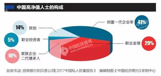 招行和貝恩的報(bào)告顯示,41%是創(chuàng)富一代企業(yè)家,29%是職業(yè)金領(lǐng),10%是家族企業(yè)二代繼承人,5%是職業(yè)投資者,14%是其他。這里的“其他”包括全職太太、運(yùn)動(dòng)員、演員、畫(huà)家等社會(huì)名流。